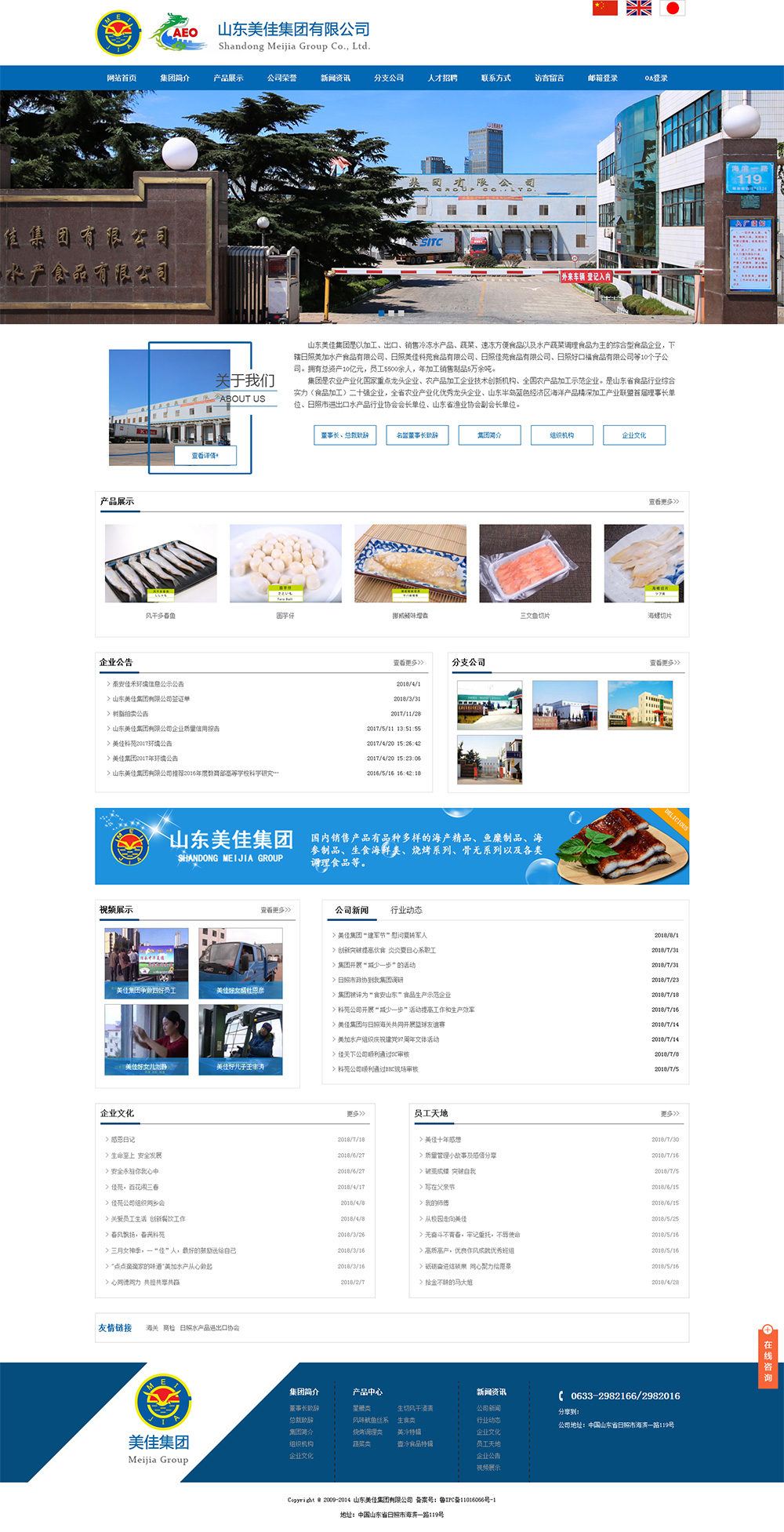 • 山東美佳集團(tuán)是以加工、出口、銷售冷凍水產(chǎn)品、蔬菜、速凍方便食品以及水產(chǎn)蔬菜調(diào) 理食品為主的綜合型食品企業(yè),下轄日照美加水產(chǎn)食品有限公司、日照美佳科苑食品有限公司、日照佳苑食品有限公司、日照好口福食品有限公司等12個(gè)子公司。擁 有總資產(chǎn)10億元,員工5500余人,年加工銷售制品5萬余噸。 公司產(chǎn)品主要包括冷凍、鹽漬、生食、蒸煮、燒烤、調(diào) 理食品等400多個(gè)品種,主要銷往日本、韓國、歐美、俄羅斯、東南亞等國家和地區(qū)。國 內(nèi)銷售產(chǎn)品有品種多樣的海產(chǎn)精 品、魚糜制品、海參制品、生食海鮮類、燒烤系列、骨無系列以及